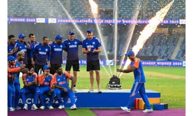 दुबई में खेले गए एशिया कप 2025 के फाइनल मुकाबले में भारतीय क्रिकेट टीम ने पाकिस्तान को 5 विकेट से हराकर इतिहास रच दिया। इस जीत ने भारतीय खेल प्रेमियों के चेहरे पर खुशी ला दी और पूरे देश में जश्न का माहौल बना। राष्ट्रपति, प्रधानमंत्री नरेंद्र मोदी, विदेश मंत्री और गृह मंत्री सहित कई नेताओं ने टीम इंडिया को बधाई दी और उनकी इस शानदार उपलब्धि को सराहा।