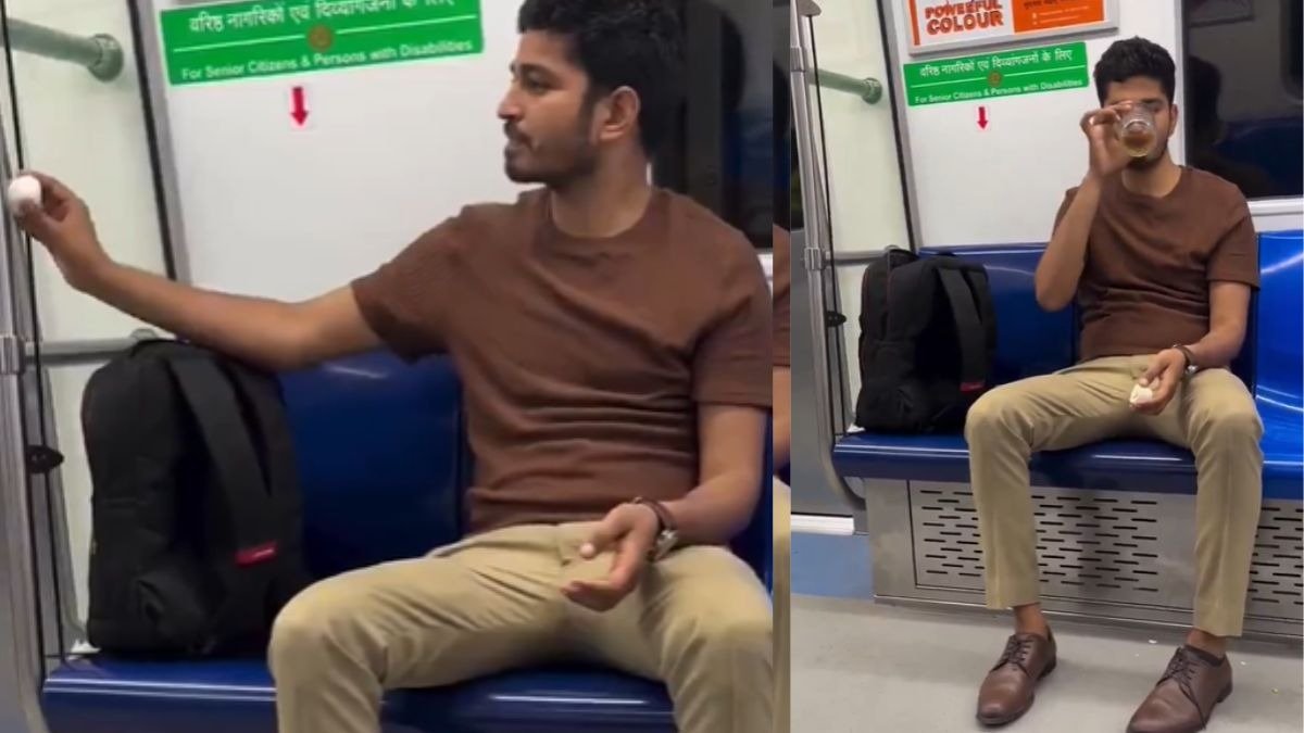 दिल्ली मेट्रो में एक बार फिर सामने आई अजीबोगरीब हरकत। इस बार एक शख्स ने हद ही पार कर दी । मेट्रो में बैठकर पहले ग्लास निकाला, फिर खुलेआम शराब का पैग लगाया और साथ ही छीलकर अंडा भी खा डाला। इस पूरी हरकत का वीडियो अब सोशल मीडिया पर तेजी से वायरल हो रहा है।