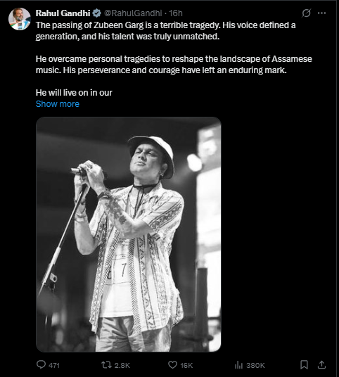 जुबीन के निधन पर प्रधानमंत्री नरेंद्र मोदी ने एक्स (Twitter) पर पोस्ट कर लिखा जुबीन गर्ग का आकस्मिक निधन बेहद दुखद है। उनका योगदान हमेशा याद रखा जाएगा। कांग्रेस नेता राहुल गांधी और असम के मुख्यमंत्री हिमंता बिस्वा सरमा ने भी जुबीन के प्रति गहरी संवेदनाएं जताईं।